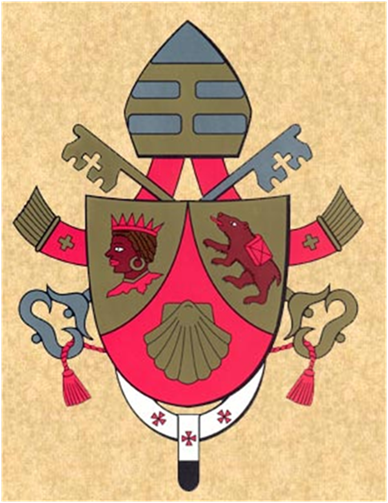 La conchiglia, inoltre è da secoli usata per rappresentare il pellegrino: simbolismo che Benedetto XVI vuole mantenere vivo, calcando le orme di Giovanni Paolo II, grande pellegrino in ogni parte del mondo. La casula da Lui usata nella solenne liturgia dell’inizio del suo Pontificato, domenica 24 aprile, portava con evidenza il disegno di una grande conchiglia. Essa è anche il simbolo presente nello stemma dell’antico Monastero di Schotten, presso Regensburg (Ratisbona) in Baviera, cui Joseph Ratzinger si sente spiritualmente molto legato. Nella parte dello scudo denominata “cappa”, vi sono anche due simboli venuti dalla tradizione della Baviera, che Joseph Ratzinger divenuto nel 1977 Arcivescovo di Monaco e Frisinga aveva introdotto nel suo stemma arcivescovile. Nel cantone destro dello scudo (a sinistra di chi guarda) vi è una testa di moro al naturale (ovvero di colore bruno), con labbra, corona e collare di rosso. È l’antico simbolo della Diocesi di Frisinga, nata nell’VIII secolo, diventata Arcidiocesi Metropolitana col nome di Monaco e Frisinga nel 1818, dopo il Concordato tra Pio VII ed il Re Massimiliano Giuseppe di Baviera (5 giugno 1817). La testa di Moro non è rara nell’araldica europea. Essa appare tutt’oggi in molti stemmi della Sardegna e della Corsica, oltre a vari blasoni di famiglie nobili. Anche nello stemma del Papa Pio VII, Barnaba Gregorio Chiaramonti (1800- 1823), apparivano tre teste di Moro. Ma il Moro nell’araldica italica in generale porta intorno alla testa una banda bianca, che indica lo schiavo reso libero, e non è coronato, mentre lo è nell’araldica germanica. Nella tradizione bavarese la testa di moro appare infatti molto spesso, ed è denominata caput ethiopicum, o moro di Frisinga.