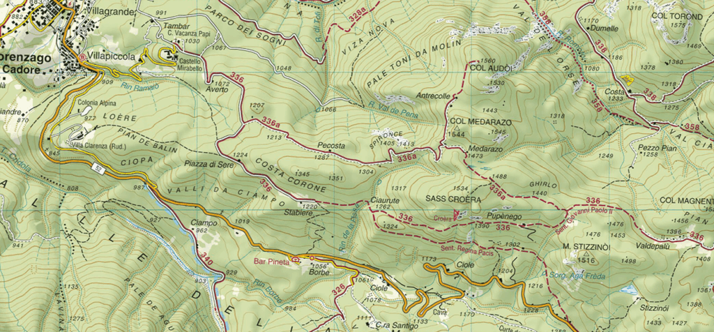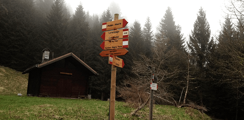 Continuando, su tratto in costa, si giunge al bivio in cui ci si ricollega con il sentiero CAI 336a; qui si prosegue a destra (sentiero CAI 17, verso Stabie-Mauria), su ampia carrareccia nel bosco, fino a giungere a Val de Palù (1390 m); qui alcune tabelle indicano una deviazione verso la “sorgente del Papa”. Si prosegue invece sulla carrareccia (ora indicata come sentiero 207 Stabie-Doana-Mauria) giungendo in breve a Stabie (1373 m) e da qui proseguendo in leggera discesa verso il passo della Mauria (tabella CAI 25), che si raggiunge in breve, girando a sinistra, una volta raggiunta la strada asfaltata.